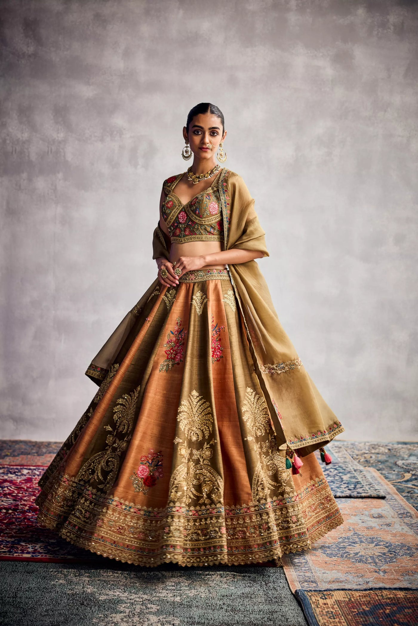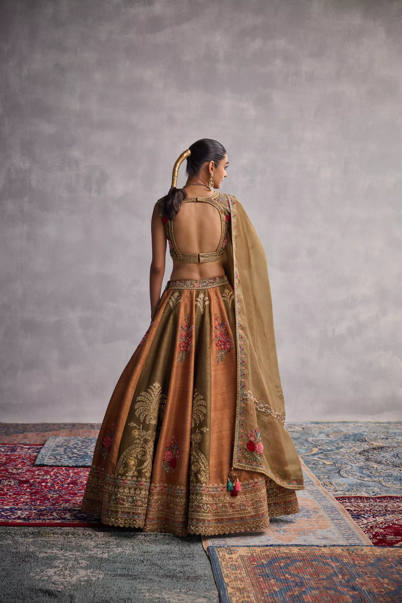 Double colored orange and green lehenga set with floral embroidery highlighted with various embellishments. Paired with embroidered blouse and dupatta.