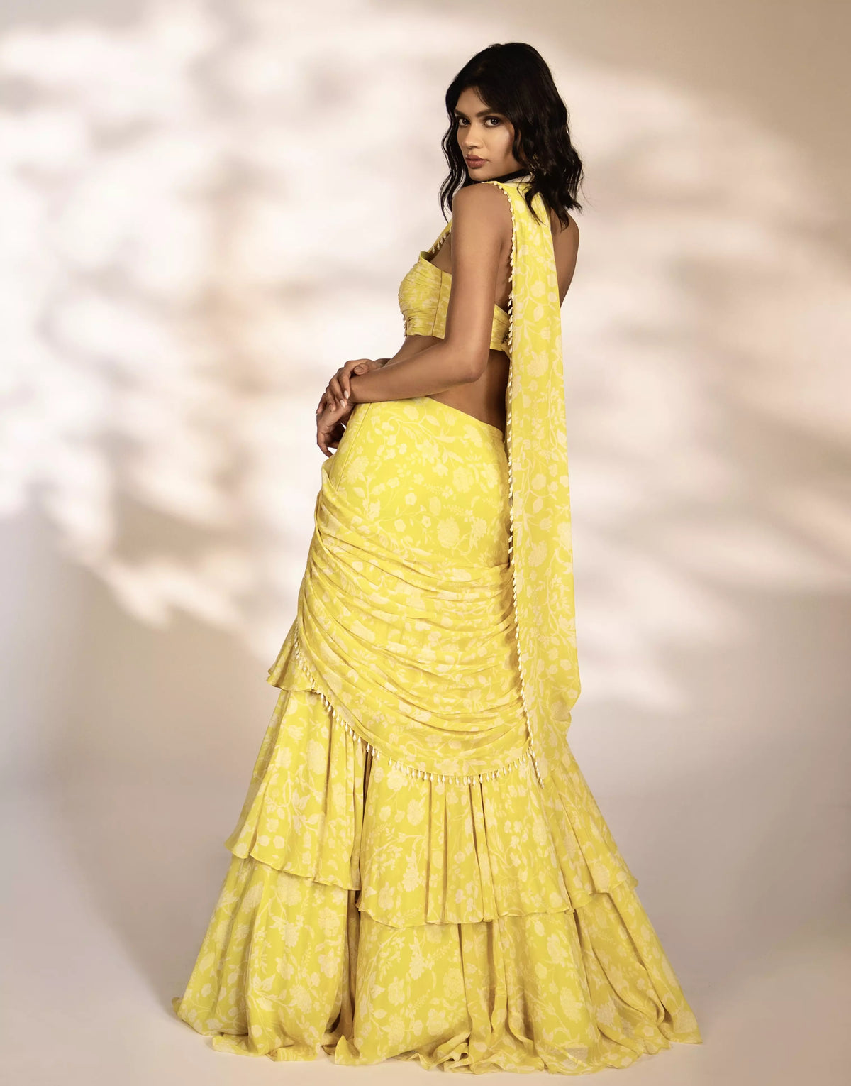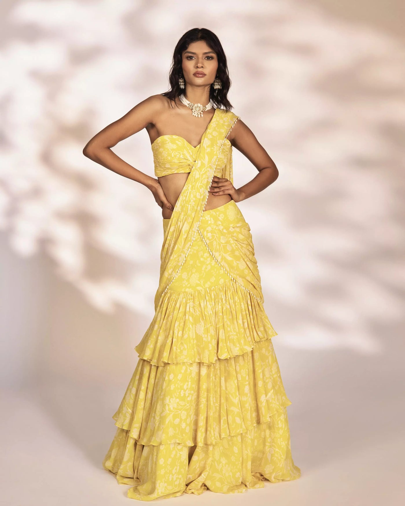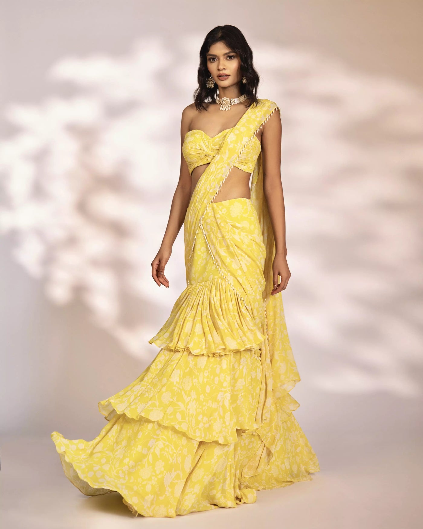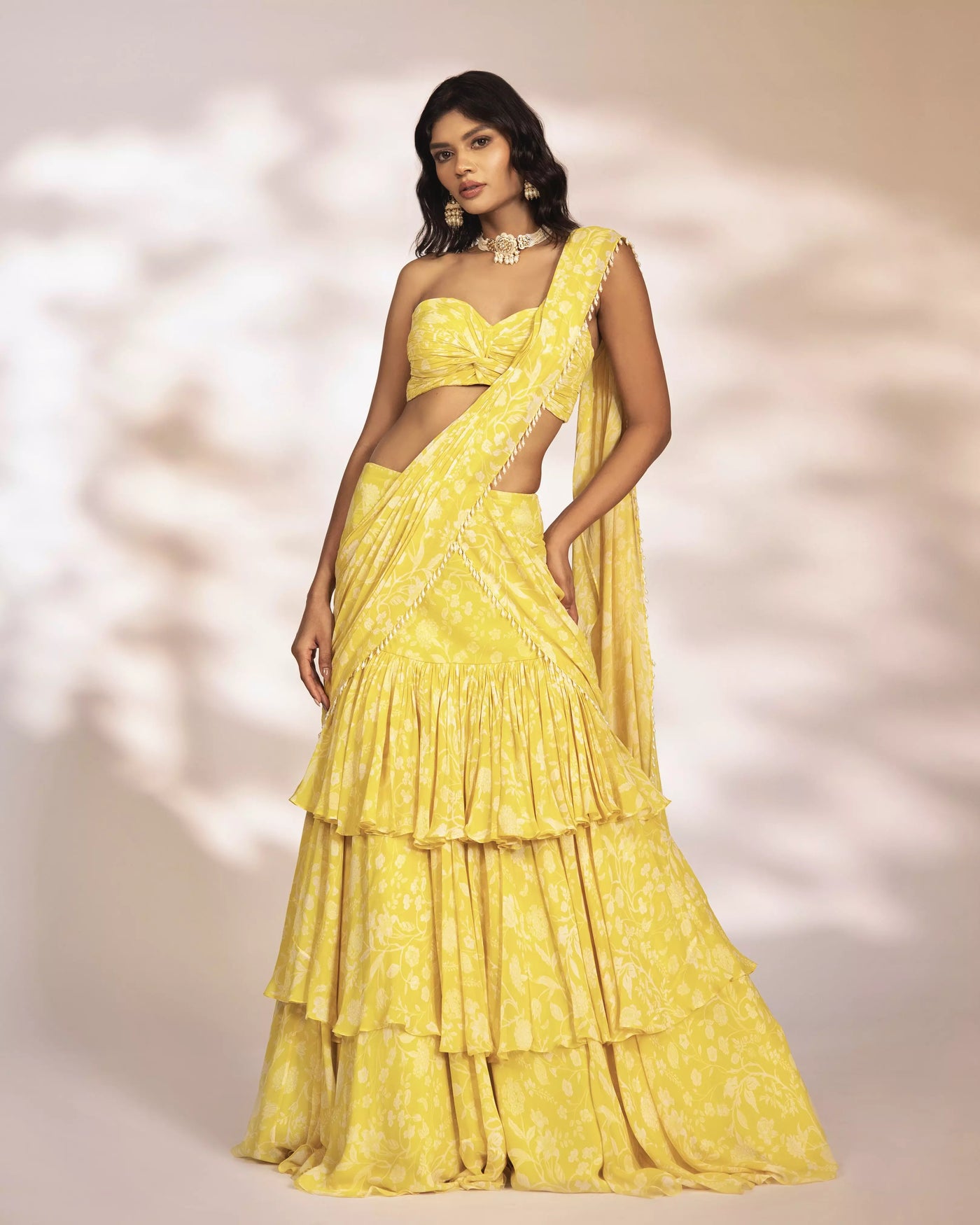 FEATURING LEONA - Yellow printed pre-draped saree with pearl embellishments on pallu and knot style ruched blouse.