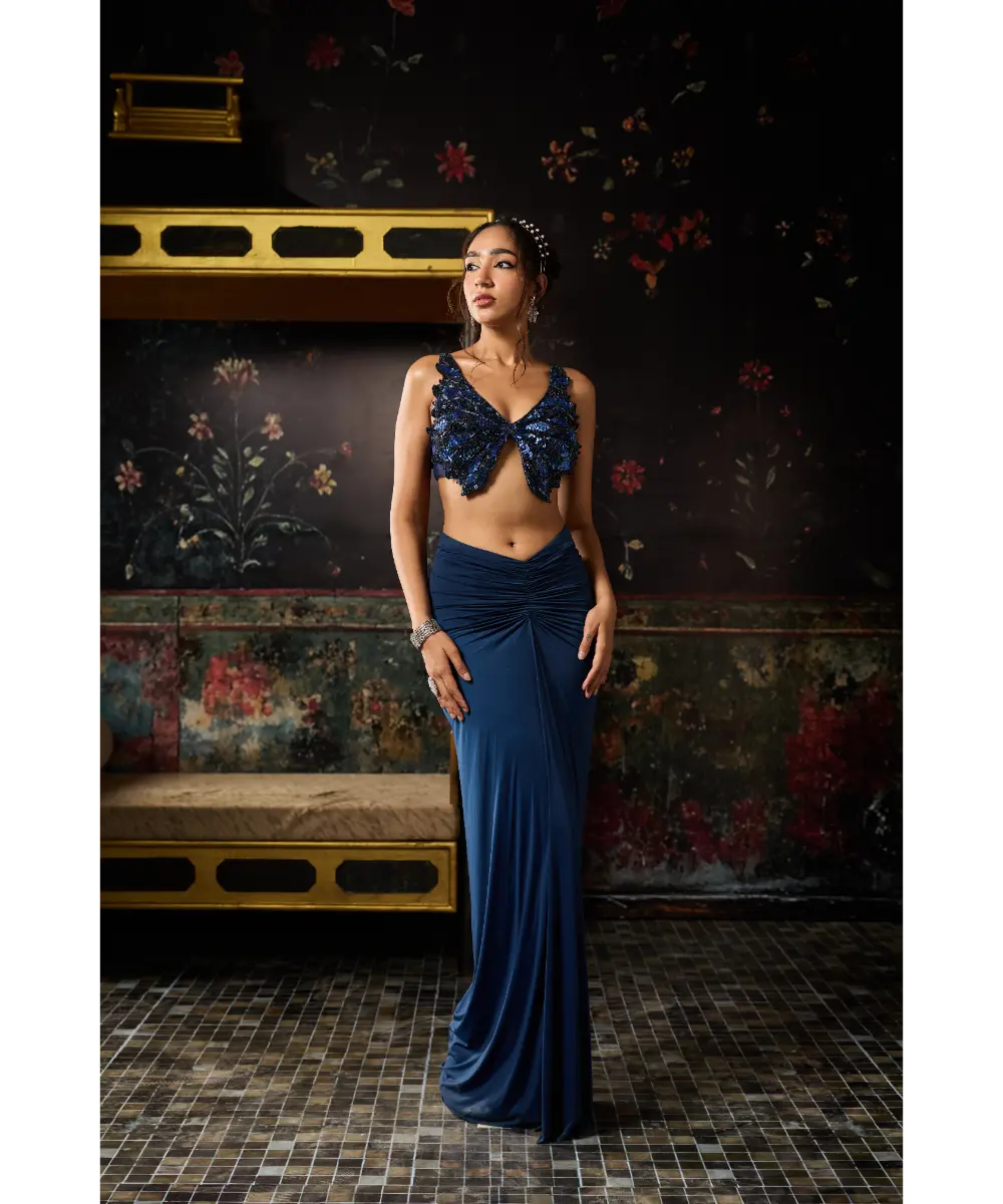 TEAL BLUE EMBELLISHED CUTWORK BUTTERFLY CUT BLOUSE WITH FITTED DHOTI SKIRT
