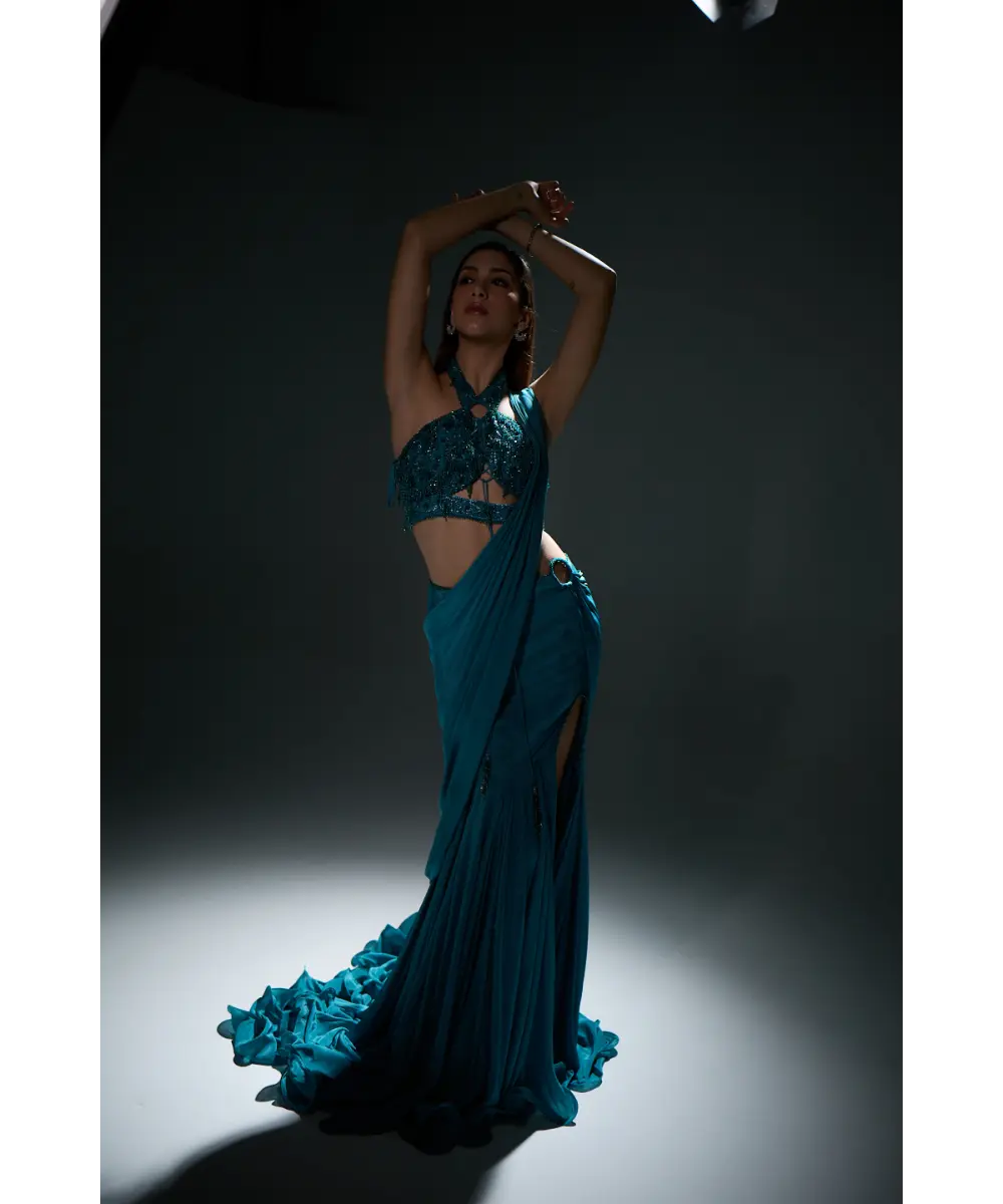 A statement drape saree featuring a long trail with dramatic hem finishes, paired with a modern-cut blouse. Embellished with Jade’s signature metal circle, the blouse is hand-embroidered with tonal pearls, crystals, and intricate aari work — perfect for the contemporary couture lover.