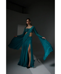 Drape saree with a crystal and tonal pearl hand-embroidered palla that extends into a trailing back, paired with a trend-forward fish-cut bottom and a full-sleeve blouse richly embroidered for a regal finish.