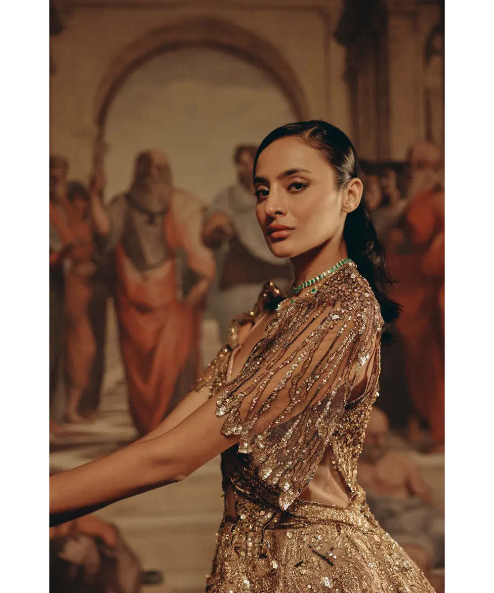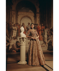 Echoing the grandeur of renaissance artistry, this rose-bronze gown exudes timeless magnificence. The sculpted bodice, accentuated with cutwork details and cascading beaded sleeves, blends strength with femininity. Intricate embroidery in sequins, beads, and crystals flows across the voluminous skirt, creating a tapestry of light and shadow