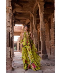 The georgette sharara set features a beautiful amalgamation of embroidery and pin tucks detailing. The tunic is embellished with decorative ruffles around the neckline and metal studs at the hem of the shirt. It is paired with a printed flared sharara and organza ruffle dupatta.
