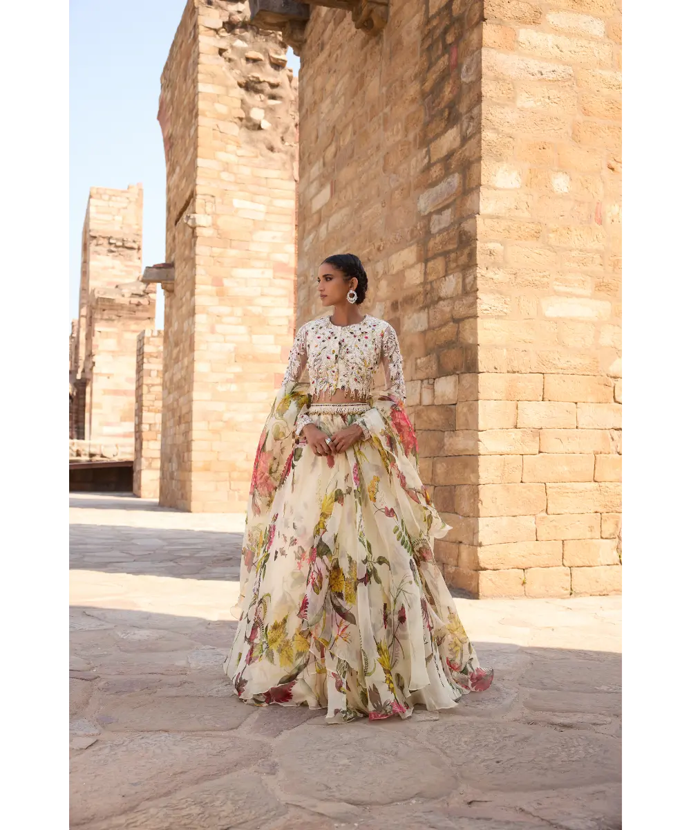 The set features fully embellished blouse with Intricate detailing all over the bodice and sleeves. It is paired with a printed flared skirt.