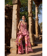 The georgette sharara set features a beautiful amalgamation of embroidery and pin tucks detailing. It is paired with printed bottom and organza ruffle dupatta.