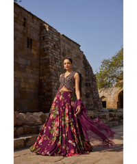 The lehenga set features a fully embellished top. It is ornated with crystals, beads and mirrors with a splash of vibrant hues. It is paired with a printed flared skirt and organza ruffle dupatta.