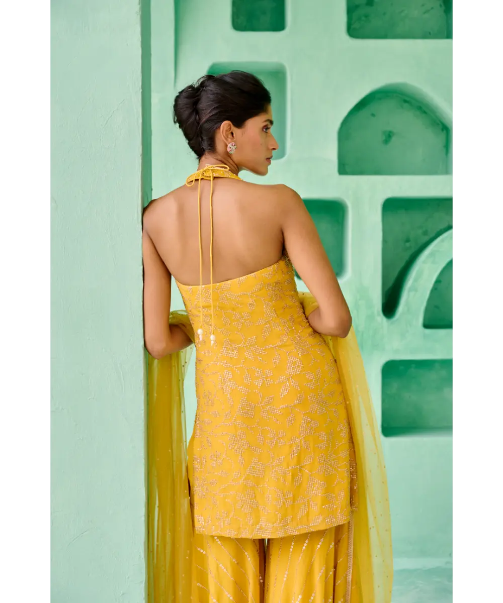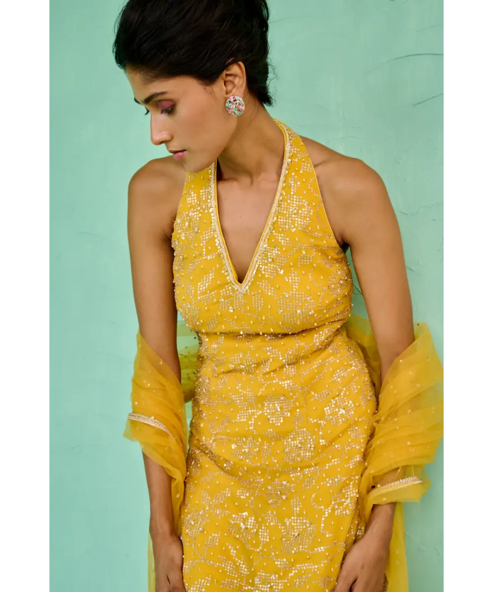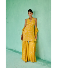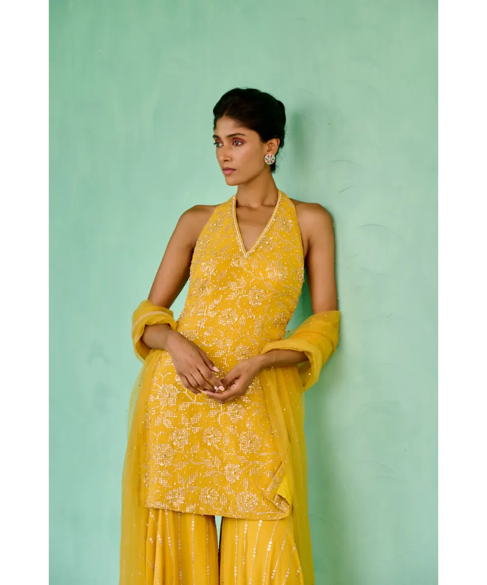 Georgette sequence embellished sharara paired with floral sequence and pearl embroidered halter neck kurta and tulle dupatta