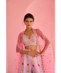 Tulip flared pants and bralette top with colorful resham and faux metallic leather embroidery paired with pink embellished tulle cape