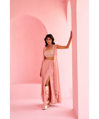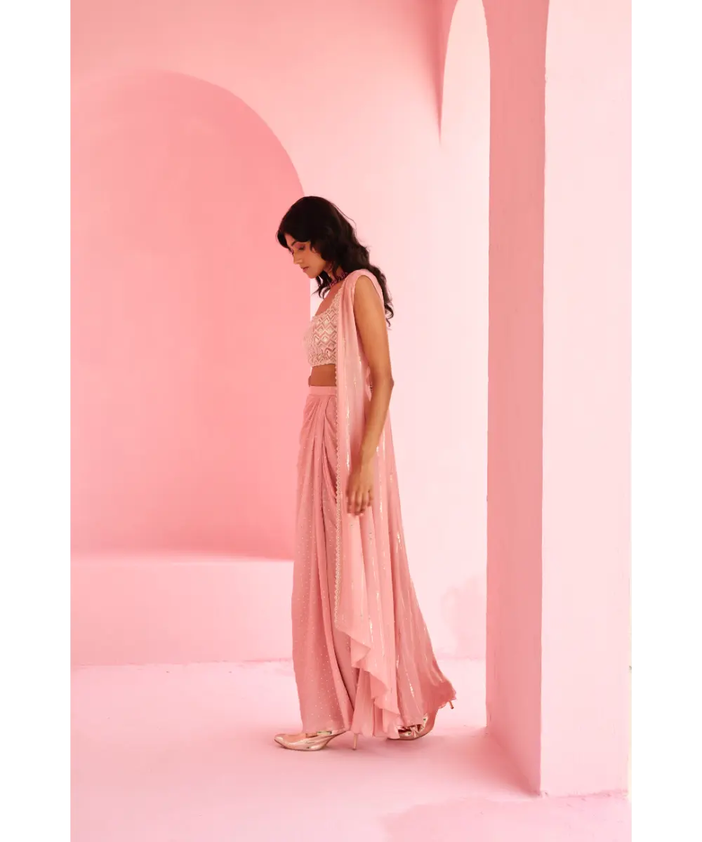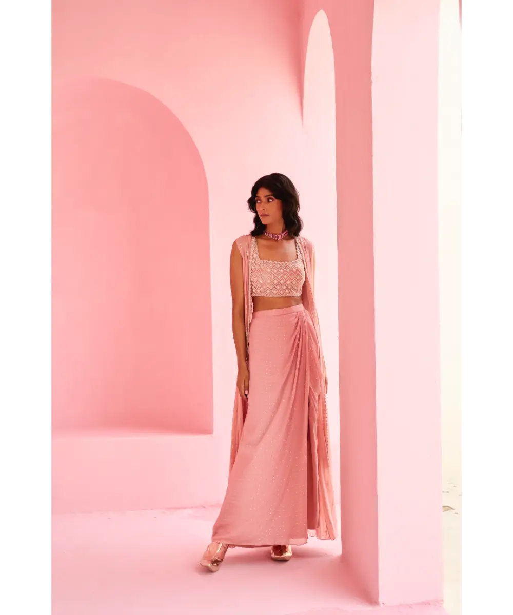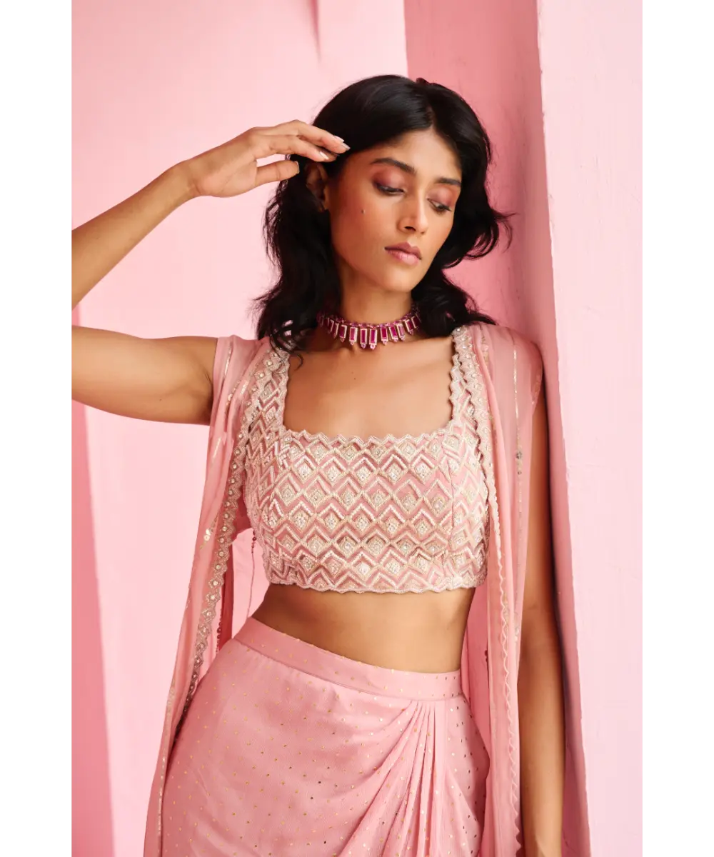 Drape skirt paired with pearl and zardozi embroidered top and embellished georgette jacket