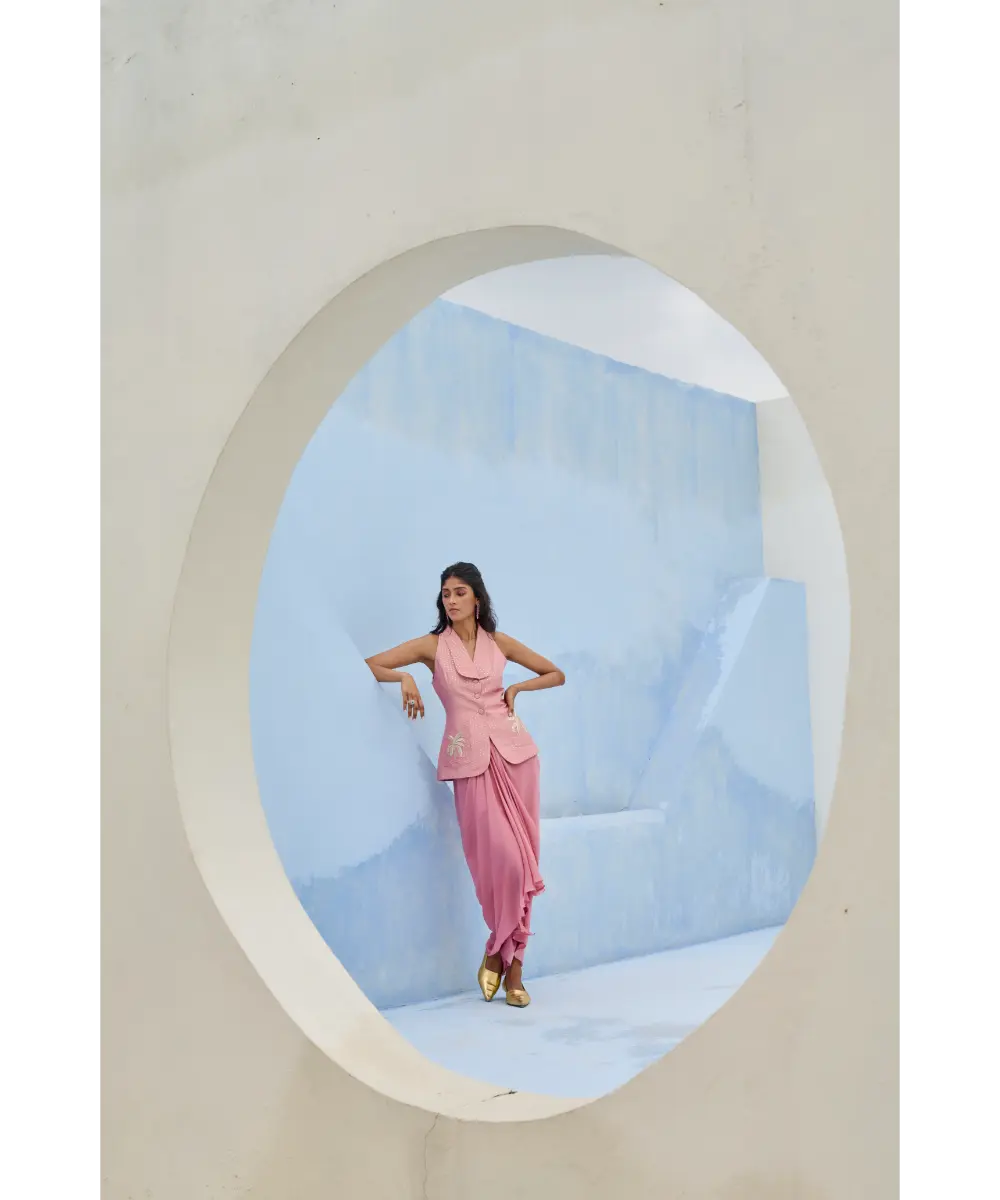 Crepe drape skirt paired with tissue silk polka woven blazer with zardozi embroidered detailing on pockets