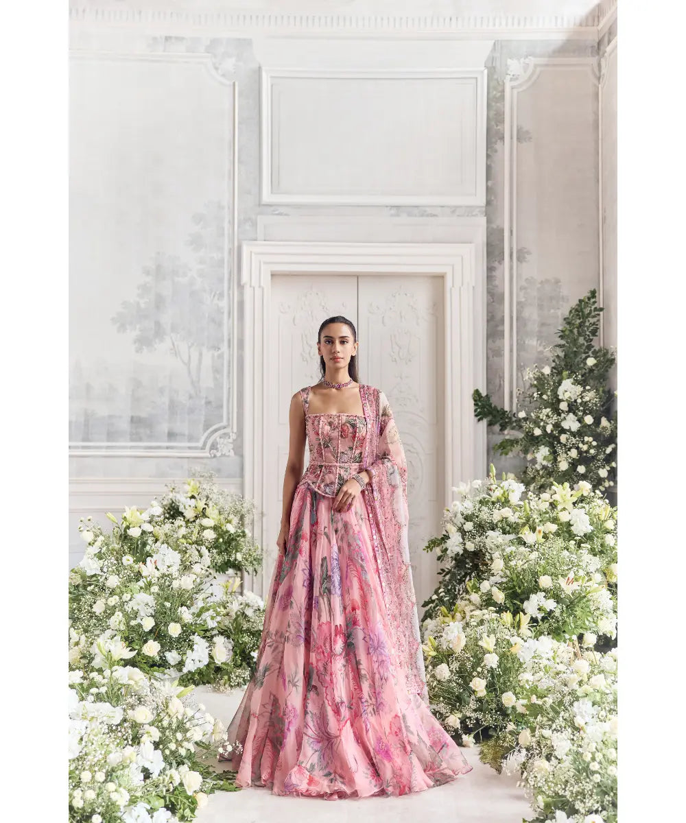 EMBROIDERED CORSET FEATURING DETACHABLE  STRAPS PAIRED WITH HEAVY DUPATTA AND  FLORAL LEHENGA