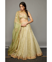 Mint green lehenga embroidered with gota patti edge with lampi stripes. Mint green organza dupatta embroidered with gota patti fine with kiran & Gold metallic blouse