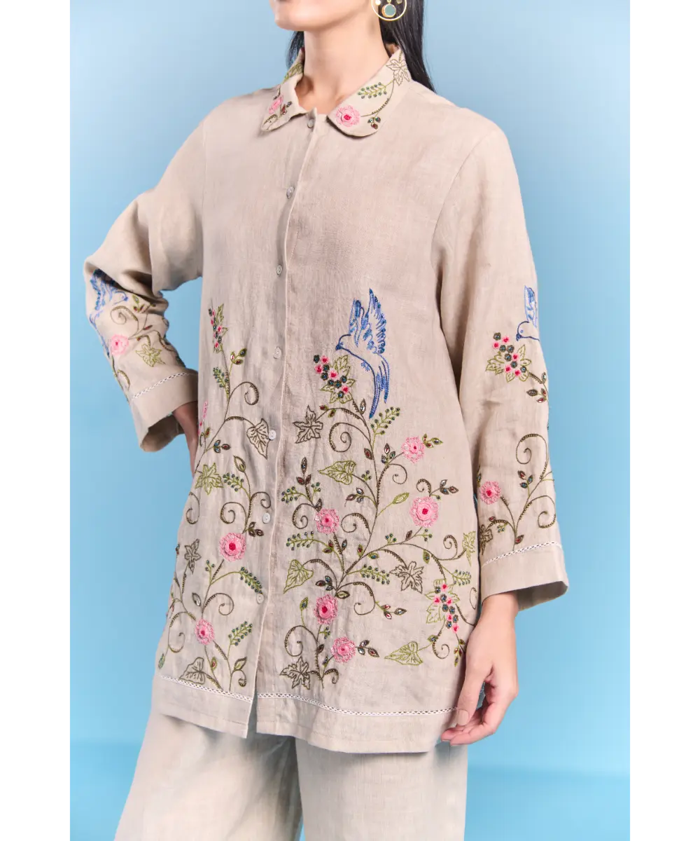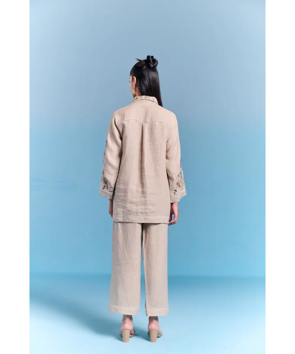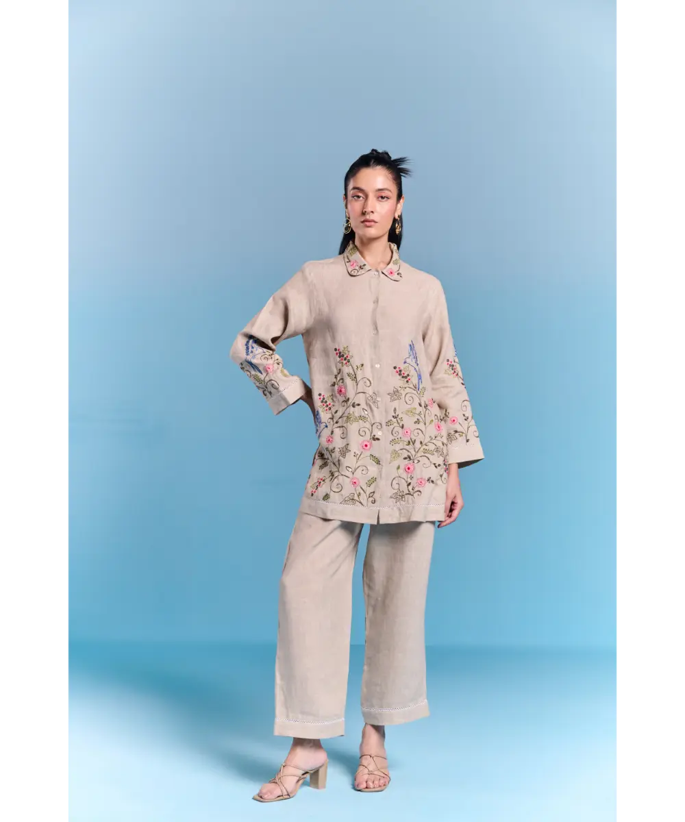 Enhance your style in nature inspired Coord set for summers. Crafted from high-quality linen fabric. The set feature the intricate hand embroidery on shirt, collar and for highlight on sleeves. The classic straight pant design provide a sophisticated silhouette that suits both casual and formal occasions. Balanced with a neutral base, this statement piece is perfect for any wardrobe.