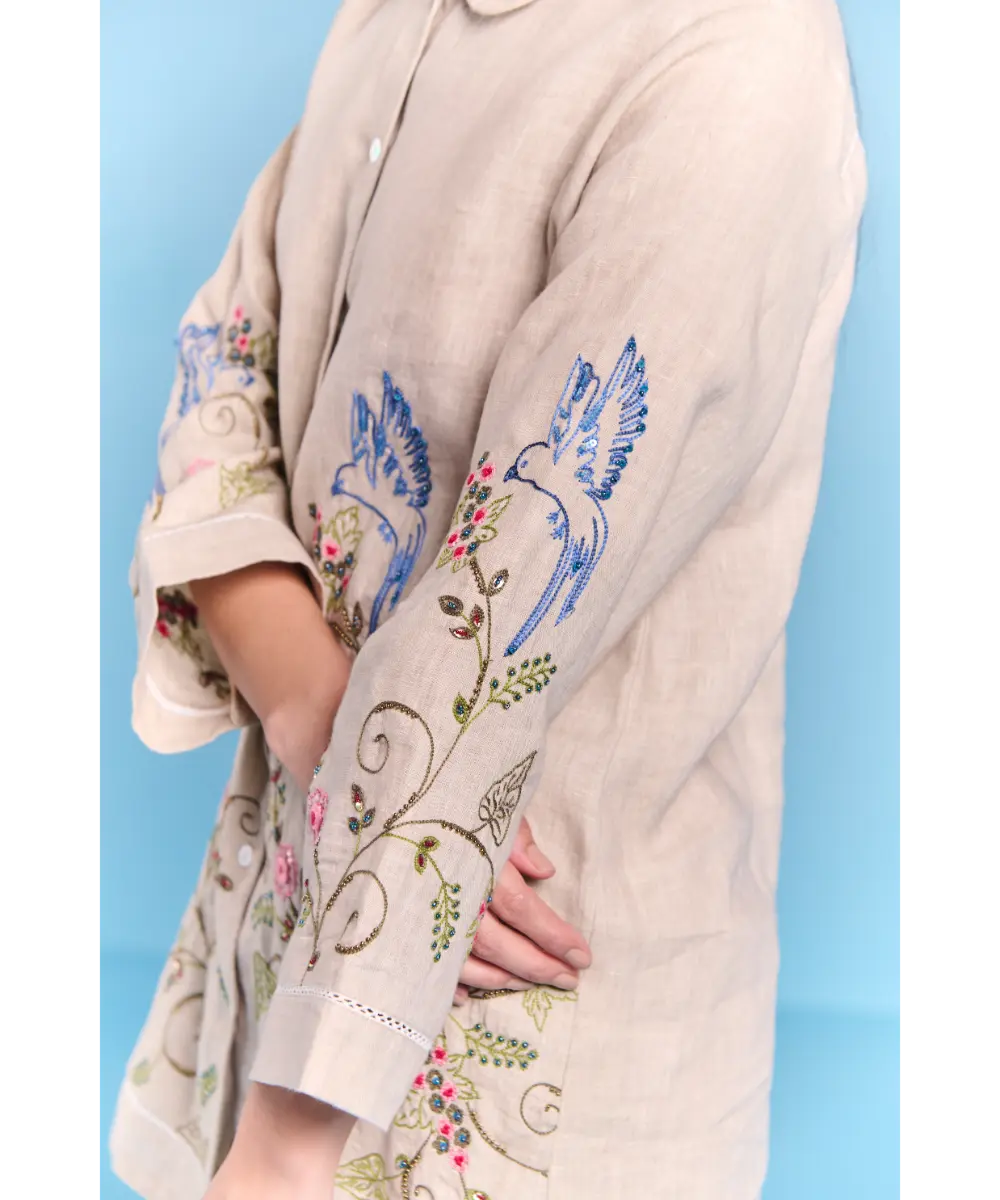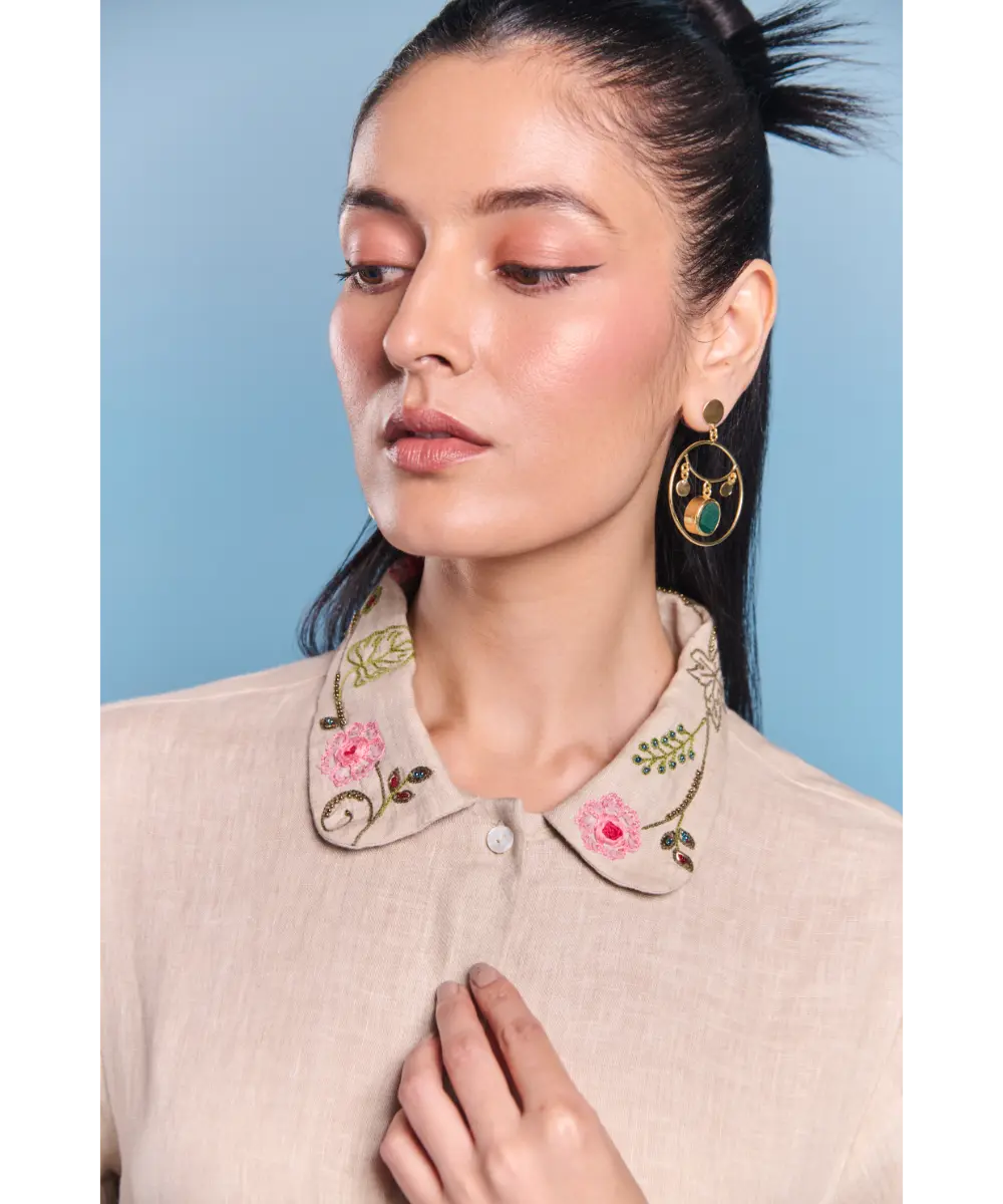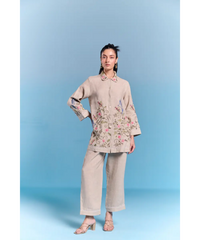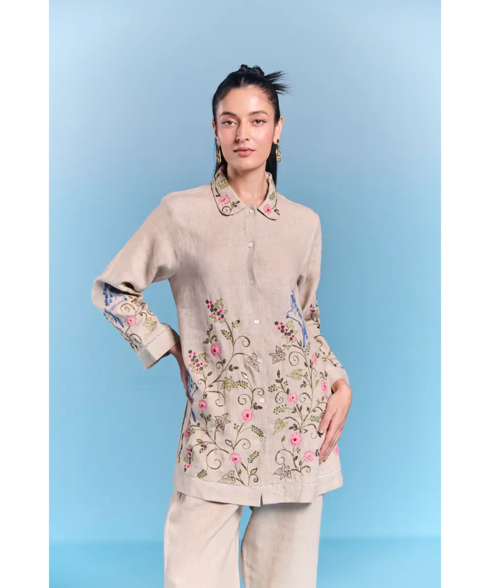 Enhance your style in nature inspired Coord set for summers. Crafted from high-quality linen fabric. The set feature the intricate hand embroidery on shirt, collar and for highlight on sleeves. The classic straight pant design provide a sophisticated silhouette that suits both casual and formal occasions. Balanced with a neutral base, this statement piece is perfect for any wardrobe.