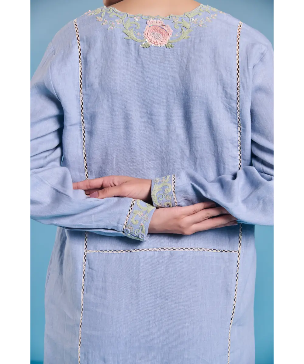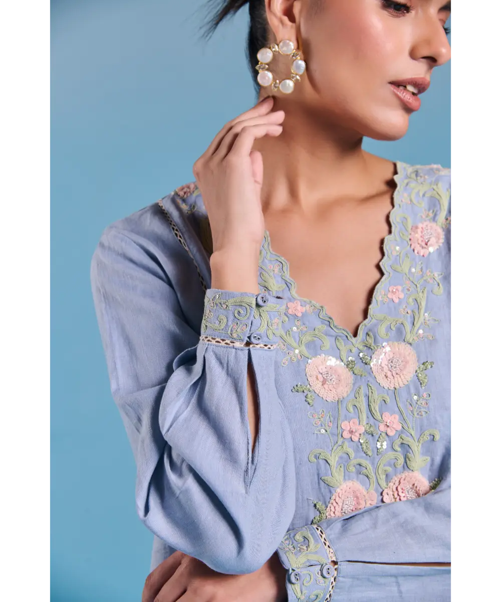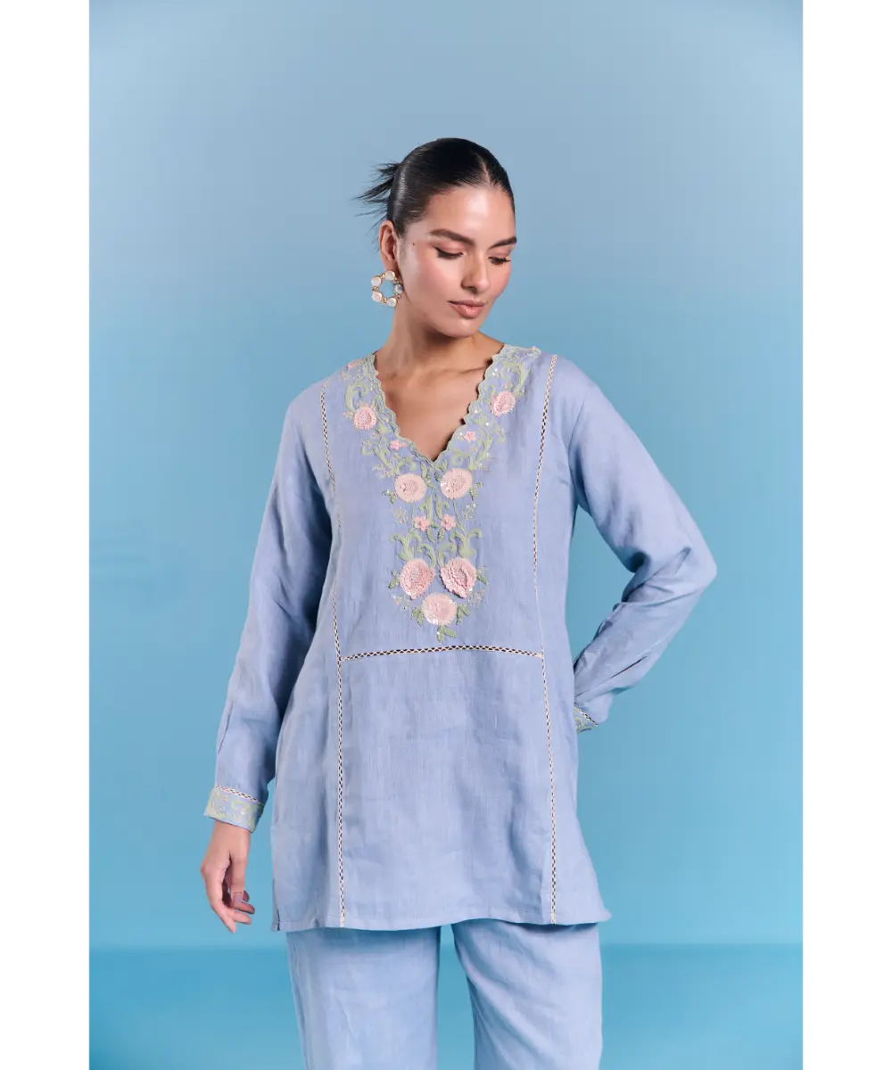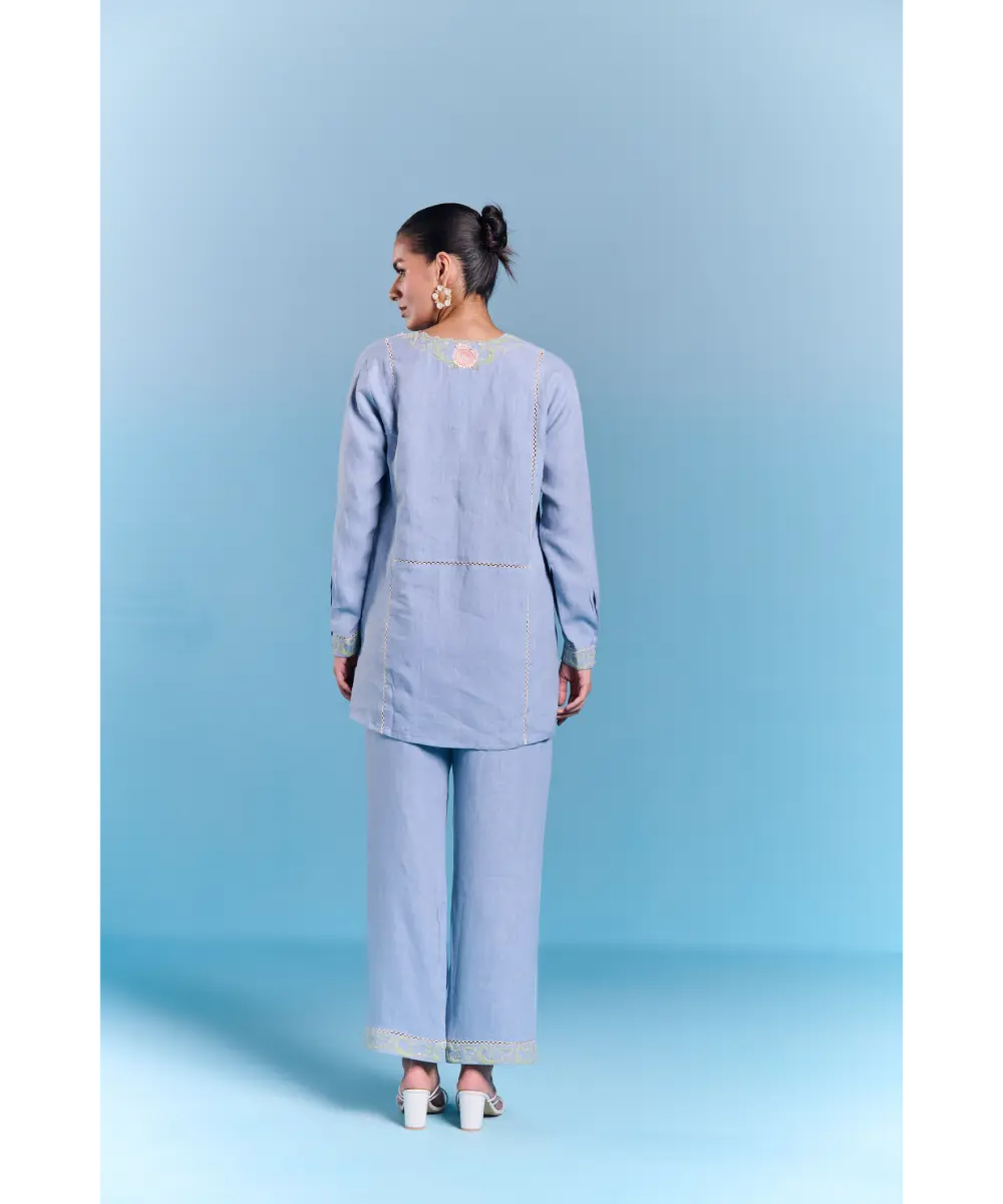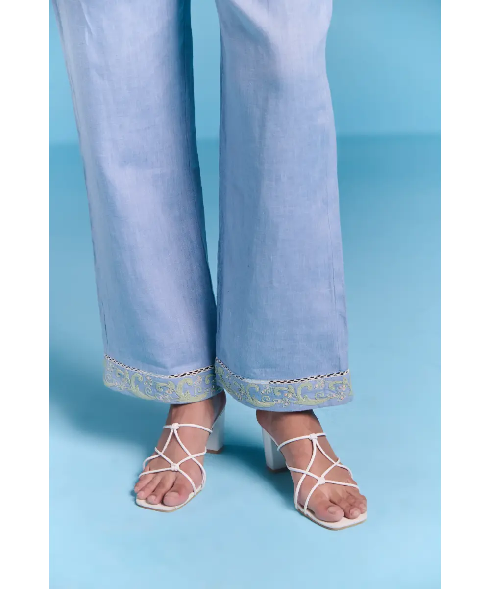 Elevate your style with the Fresh And Subtle Cord set. It has V shaped neckline with intricate floral detailing. Adorned with handwork embroidery and lace detailing on top while the straight-cut trousers complement the design seamlessly. Crafted from breathable fabric, this ensemble is perfect for effortless daytime chic or a refined evening look.