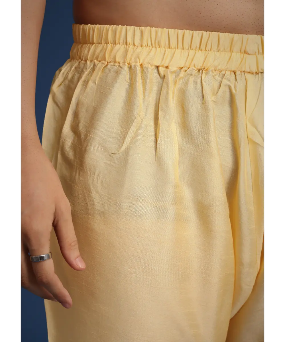 Embodying regal elegance, this gold silk sherwani set is a beautiful masterpiece of traditions and heritage. Adorned with sequin, pearl and dori embroidery, the sherwani is highlighted with a mandarin collar, hook-eye placket and comfortable full sleeves. Completed with a kurta, churidar, dupatta, and a mala, this resplendent ensemble adds to your sophisticated charm. Awarded as the Most Trusted Brand, we're delivering styles you love, just as promised.
