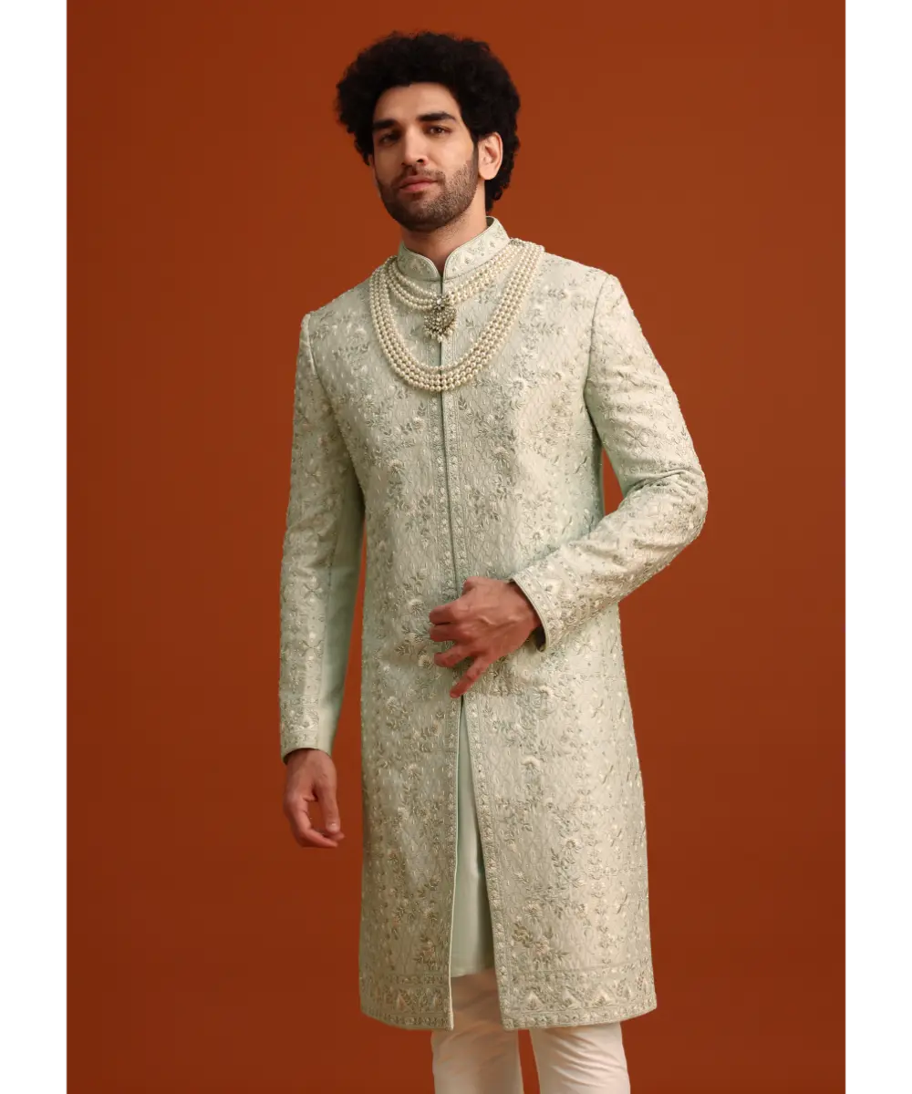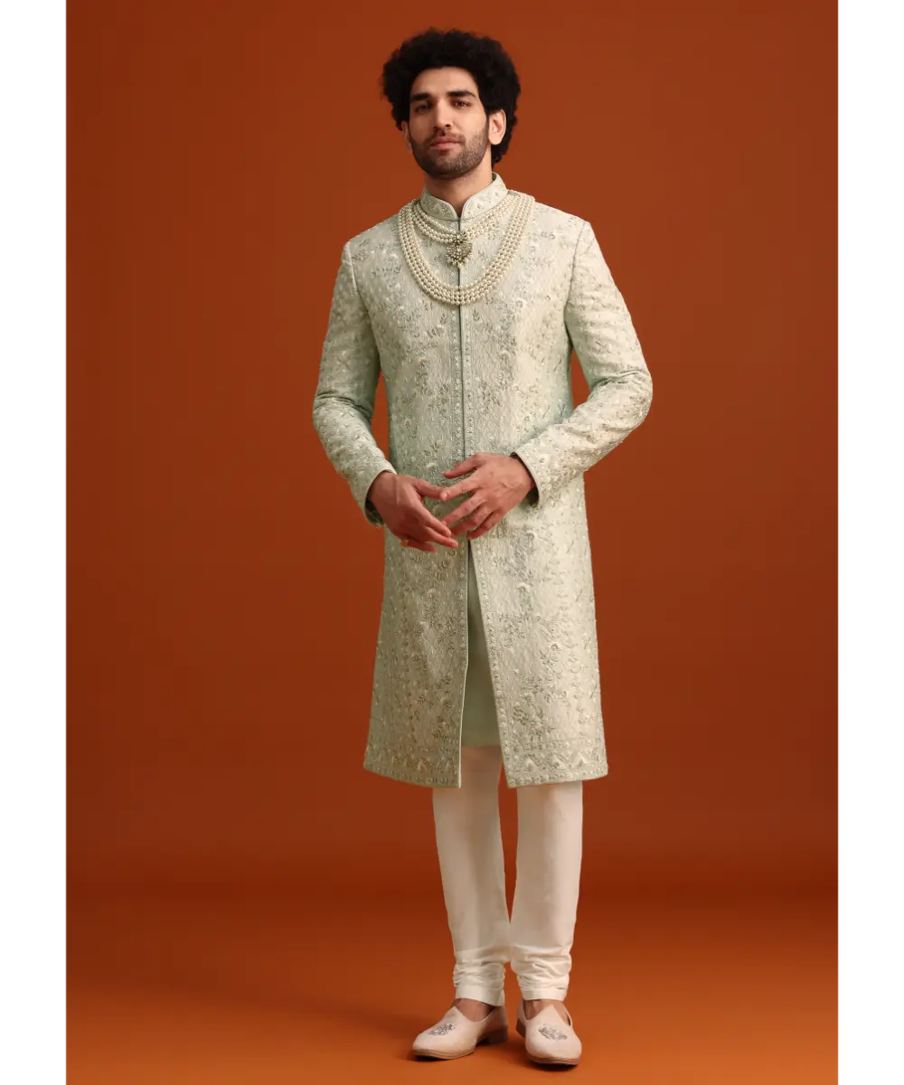 Offering a resplendent look this serene mint green sherwani set in luxurious silk redefines traditional glamour. Elevated with exquisite hand embroidery the jacket is enhanced with glistening accents of cutdana salli pearl and resham work. Designed with a mandarin collar and full sleeves this set is completed with a kurta coordinating pants and an elegant dupatta. Awarded as the Most Trusted Brand, we're delivering styles you love, just as promised.