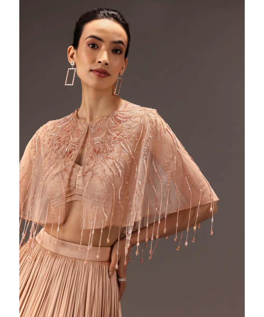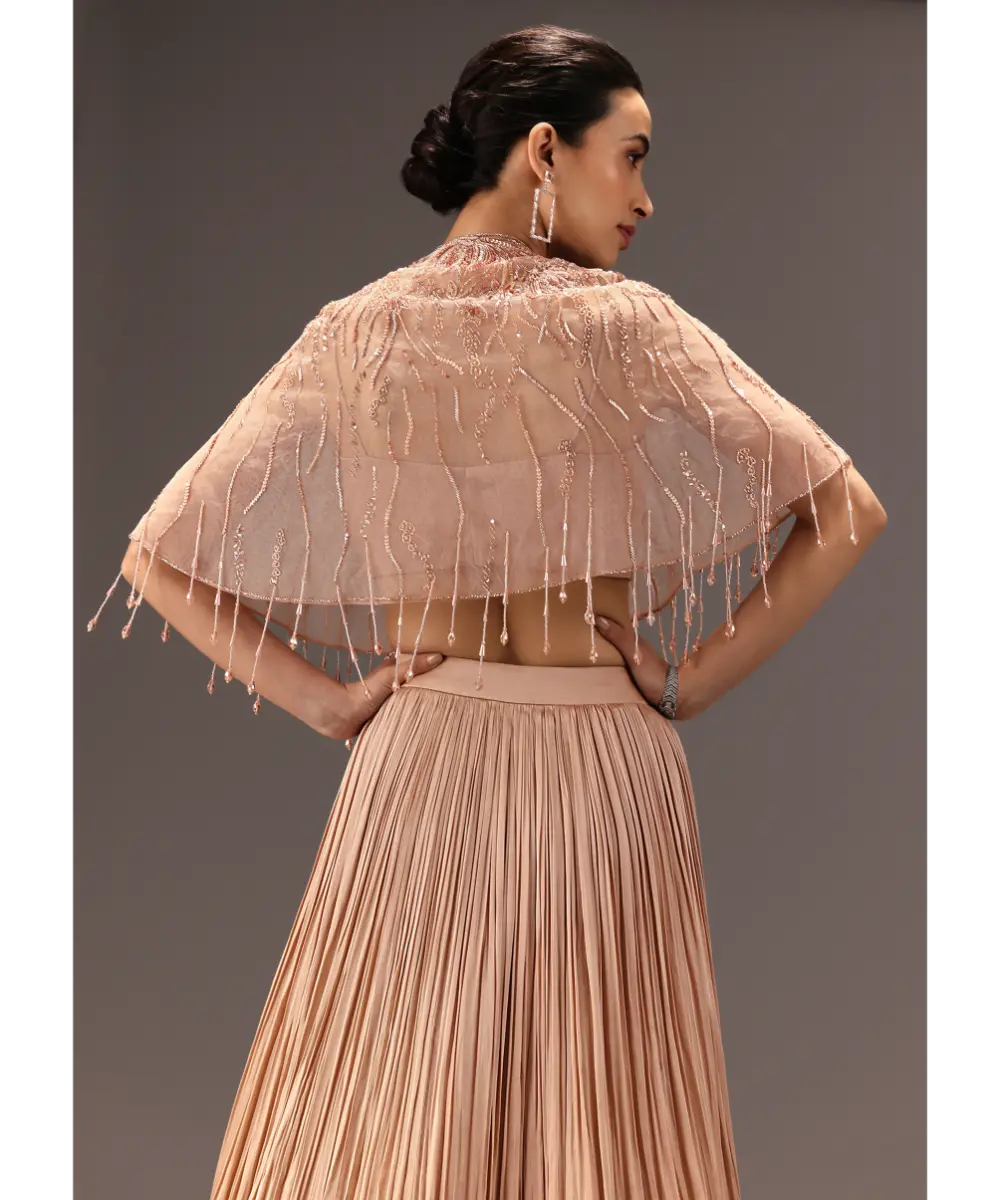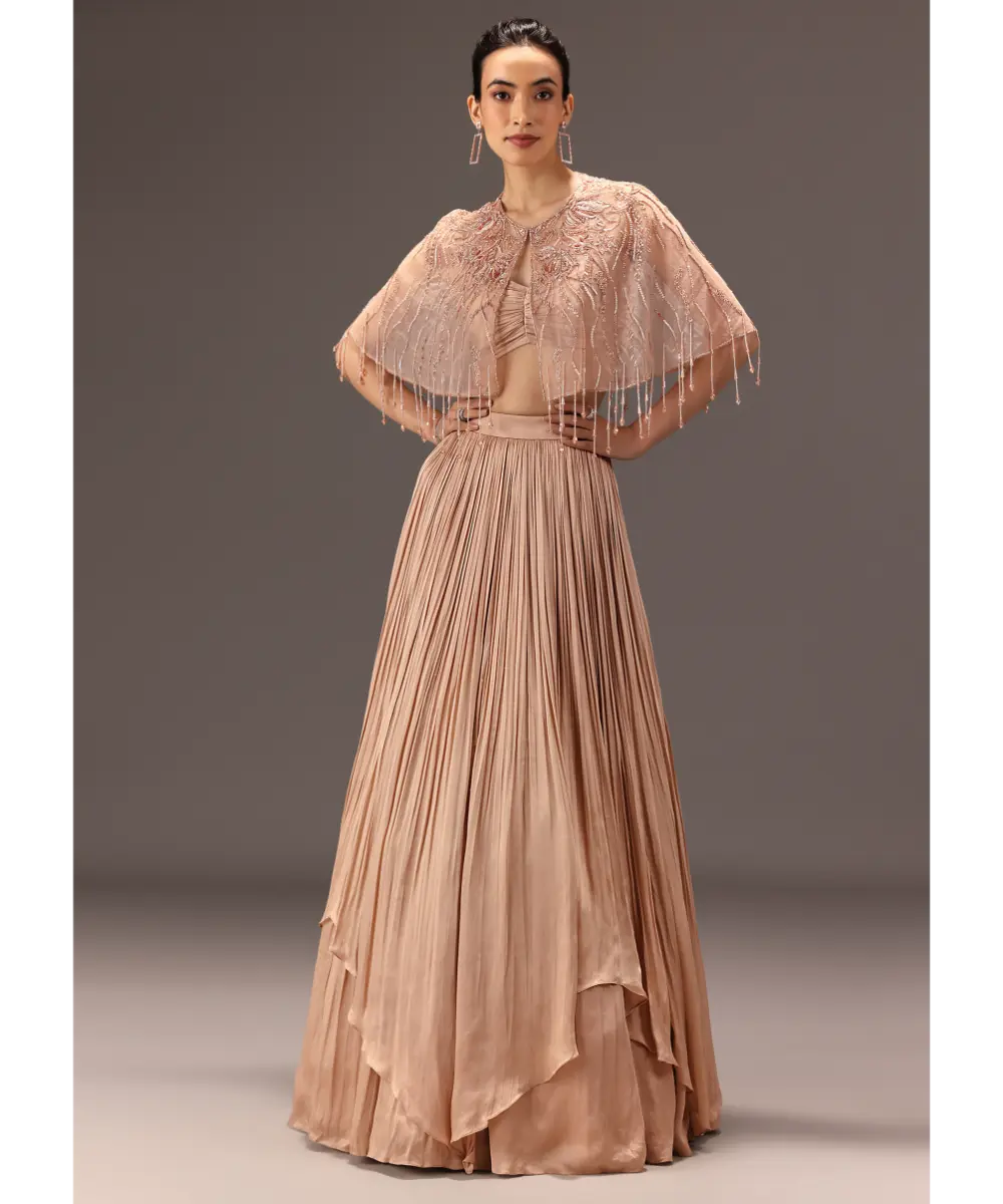 KALKI - Nude Ruched Blouse With Cape And Layered Skirt