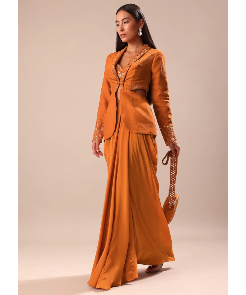 KALKI - Rust Organza Jacket With Bustier And Draped Skirt - XS