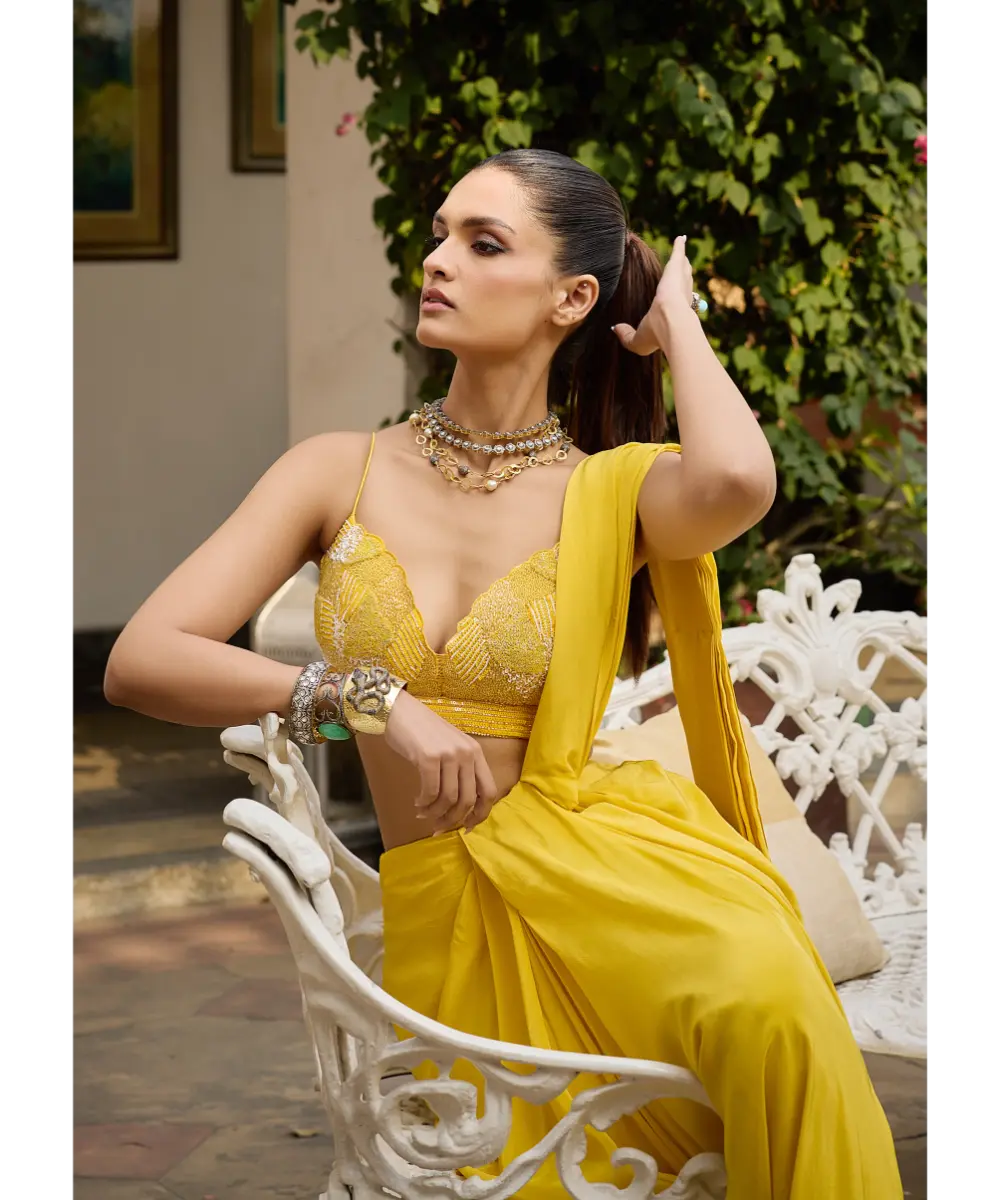 Step Into Bold Elegance With This Yellow Crepe Draped Saree Paired With A Handembroidered Blouse. Crafted From Luxurious Crepe Fabric The Saree Features A Contemporary Draped Silhouette That Exudes Modern Charm And Sophistication. The Exquisite Blouse Is Adorned With Intricate Cutdana Beads Sequins And Crystal Hand Work Adding A Touch Of Opulence And Glamour. Perfect For Cocktail Parties And Evening Soirees This Ensemble Effortlessly Blends Contemporary Chic With Traditional Allure.Awarded As The Most Trusted Brand We'Re Delivering Styles You Love Just As Promised.