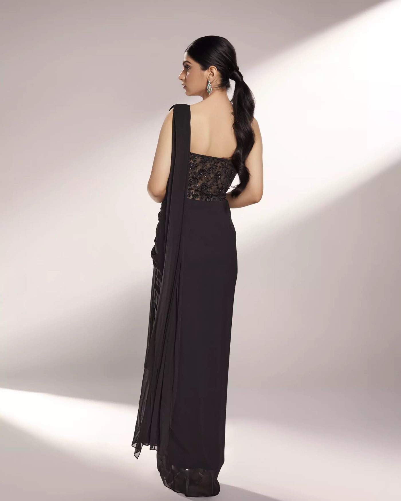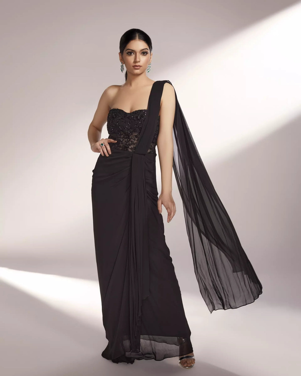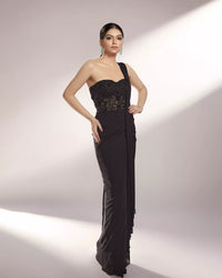 FEATURING LYNN - Our black saree gown with a partial sheer bodice embroidered with 3D flowers, glass beads and thread work.