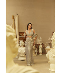 A pre-stitched modern saree is made in soft silver shine fabric, adorned in delicate pearl layers. A rushed blouse intricately embellished with pearls, adds a touch of sophistication. A perfect blend of modern ease and classic opulence.