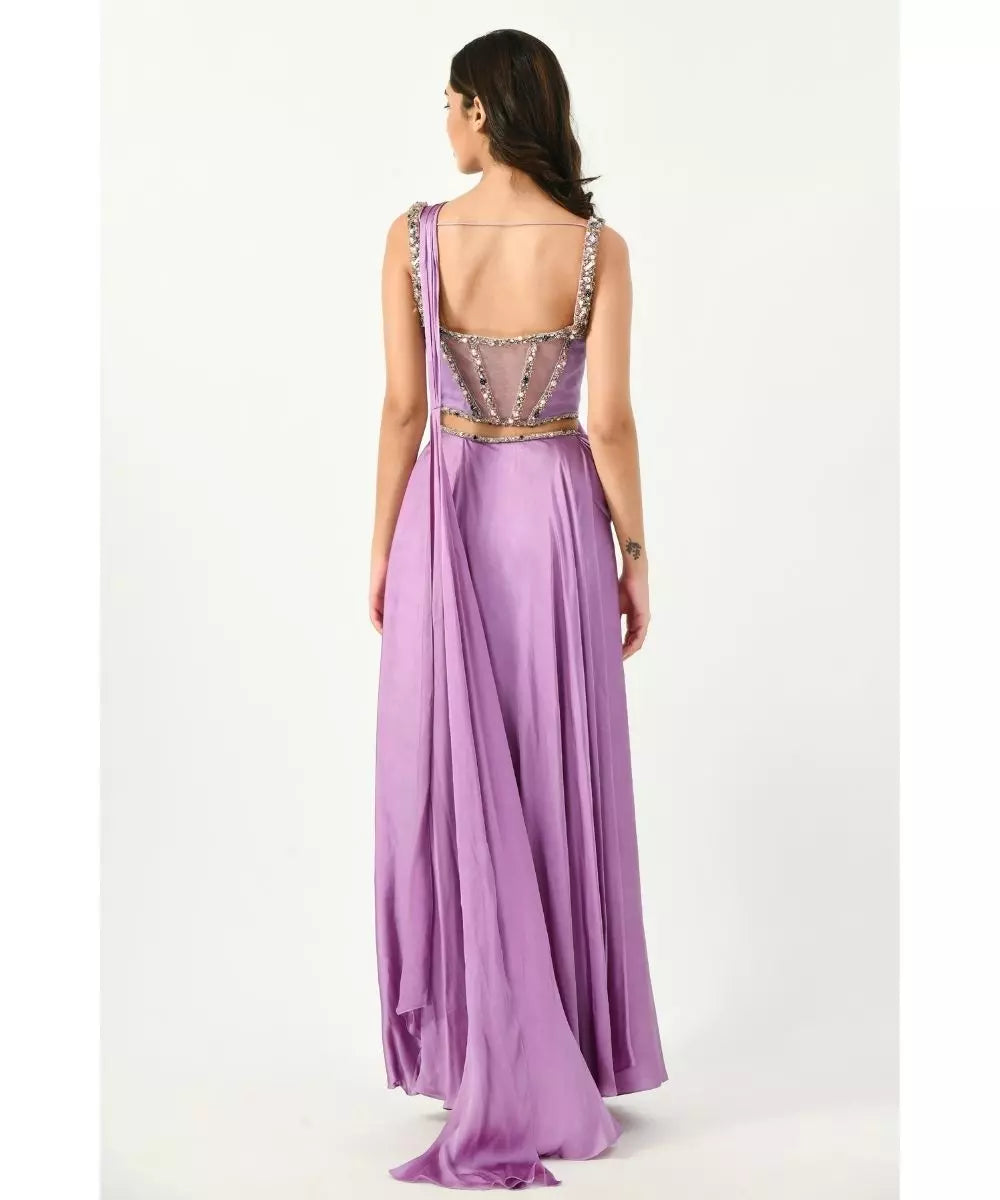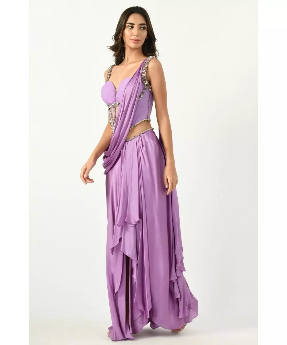 "Our Alisha Saree set is one-of-a-kind attire that speaks of life and color. The asymmetric drape on the skirt gives a modern touch to traditional ethnic attire. The vivid details are fascinating along with an attached pallu. The corset-style blouse is highlighted with heavily studded beads and crystals with pleats over the bust to make it more special. A perfect show stealer with style so surreal that it makes you the epitome of elegance and grace.  Sheer Fabric around the waist The blouse highlighted with beads and crystals Side zip closure in both skirt and blouse Asymmetric drape with a long trail of pallu attached to the skirt "