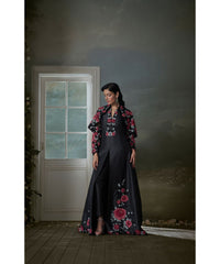 Black long dress with front slit with a short jacket and trouser with multicolored resham embroidery embellished with sequins and crystals. Floral embroidered black long dress with a short  jacket and trouser