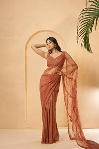 Featuring a dust pink pre-stitched, drape saree, with intricate self on self work on blouse and pallu of the saree. The saree is made up of Georgette and Net.