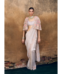Introducing the Amour Jacket Saree Set, an exquisite fusion of contemporary flair and artisanal elegance. This enchanting ensemble features a short 3D floral-embellished cape, imparting a whimsical touch, while the blouse is adorned with intricate floral detailing along the neck and hem, enhancing its feminine allure. The organza tissue foil pre-draped saree, embellished with a delicate scallop border, cascades effortlessly, creating an ethereal silhouette.