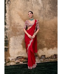 A ravishing red ensemble, where an intricately embellished blouse meets a pre-draped chiffon saree with scallop detailing, delivering a vibrant flourish steeped in tradition.