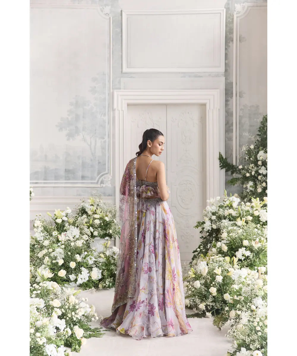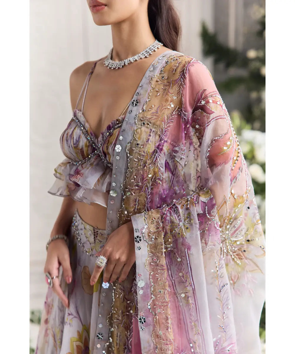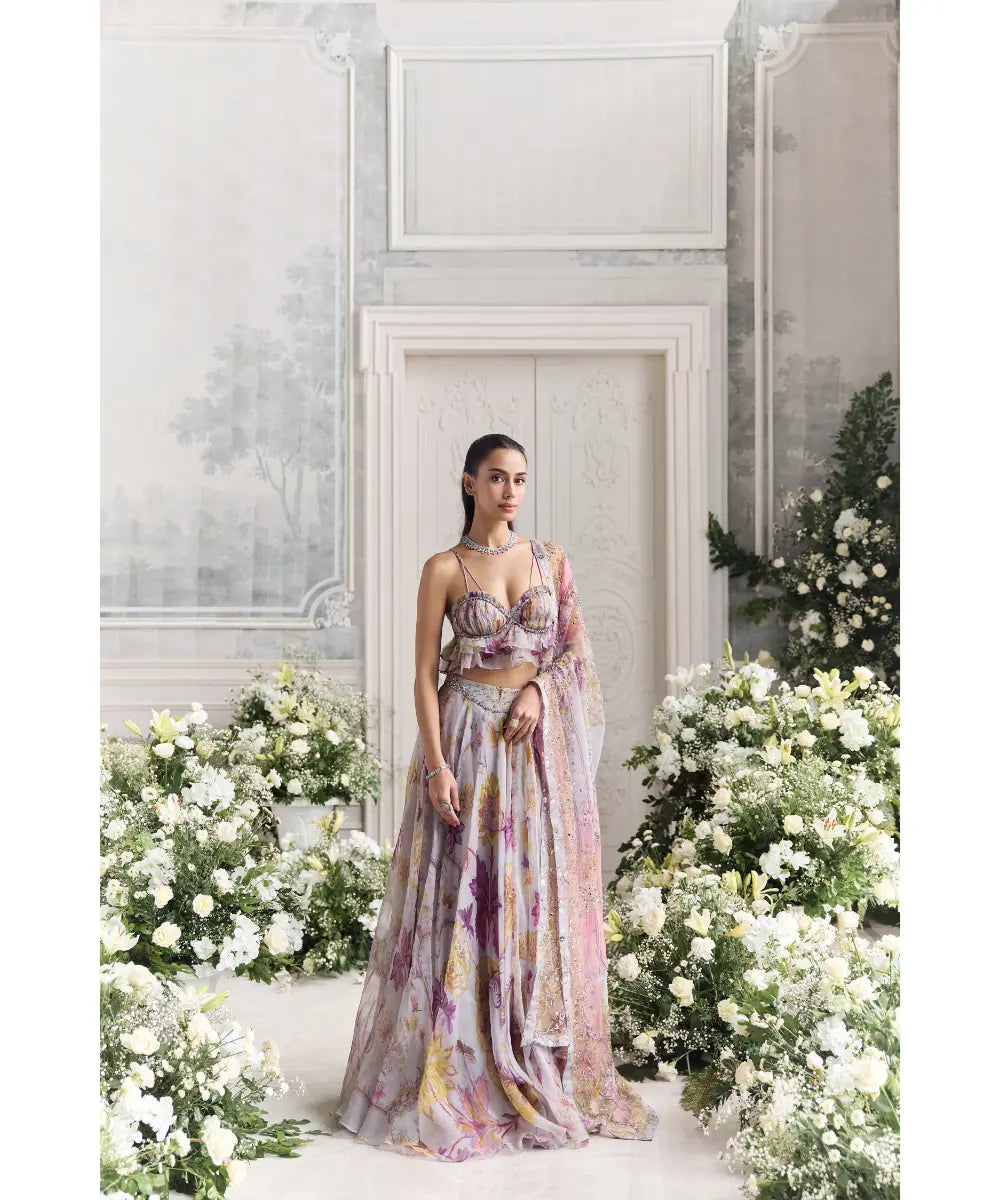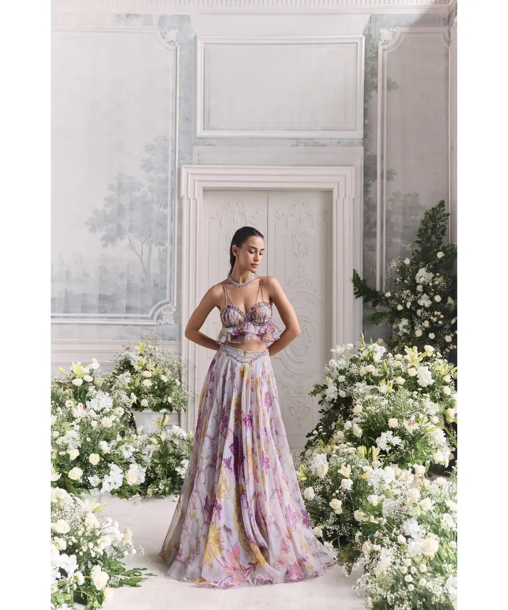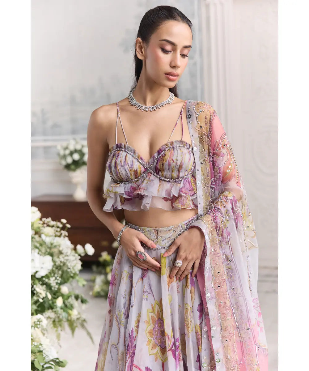 RUFFLED BUSTIER PEPLUM TOP PAIRED  WITH HEAVY CHUNNI AND FLORAL LEHENGA
