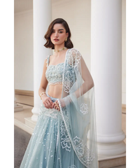 Powder blue pure silk organza skirt which has a drop waist detail it has pear, sequins and stones had embroidery on the lehenga. It is paired with a floral jaal embroidered matching blouse and a net dupatta.