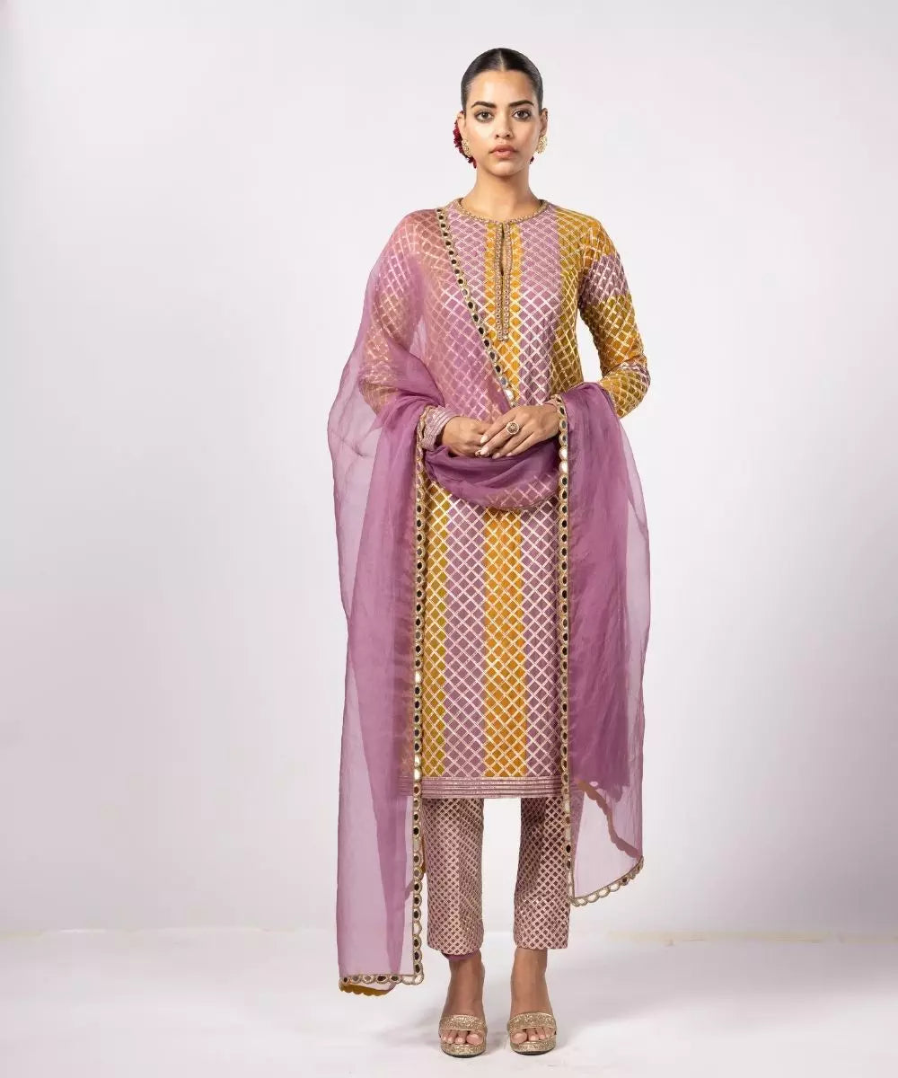 A vibrant multicolor kurta in mustard, mud mauve, green tones, adorned with golden gota embroidery, paired with a straight pants and dupatta set.
