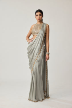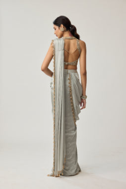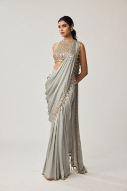 VVANI VATS - Powder Grey Mirror Satin Saree Set - XS