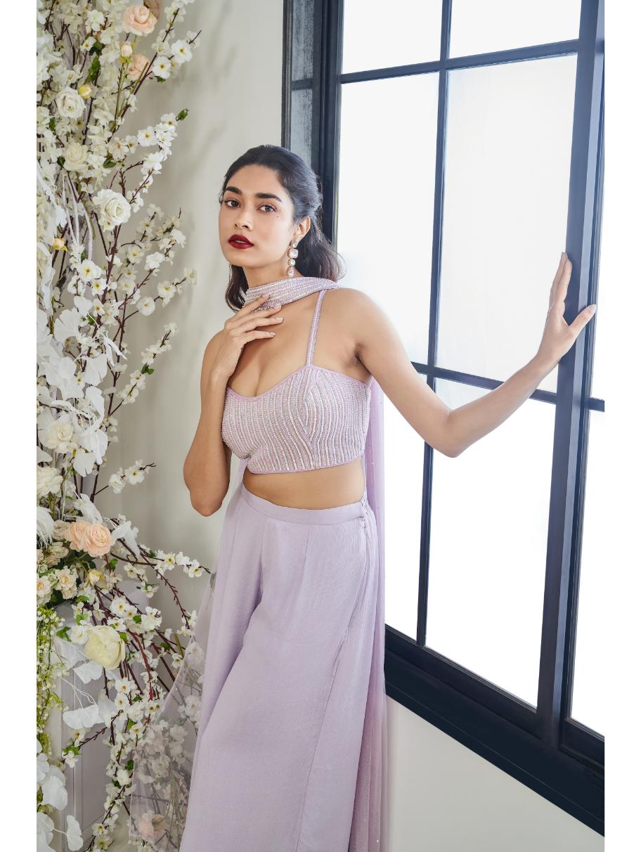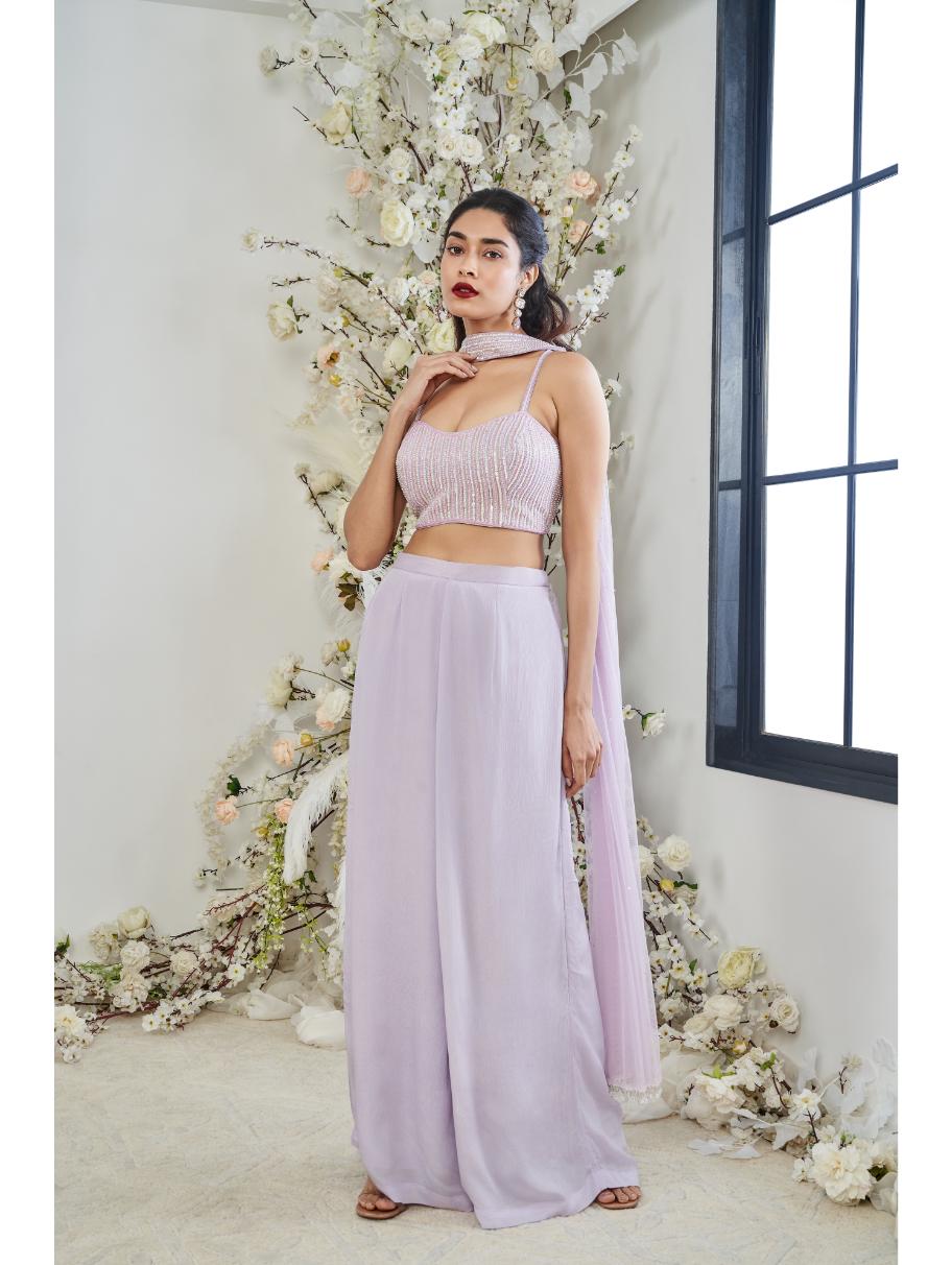 A lilac 3 piece set flared pants in wrinkle chiffon base with pearl, sequin, cutdana on blouse and it is paired with neck dupatta with crystal tassels.