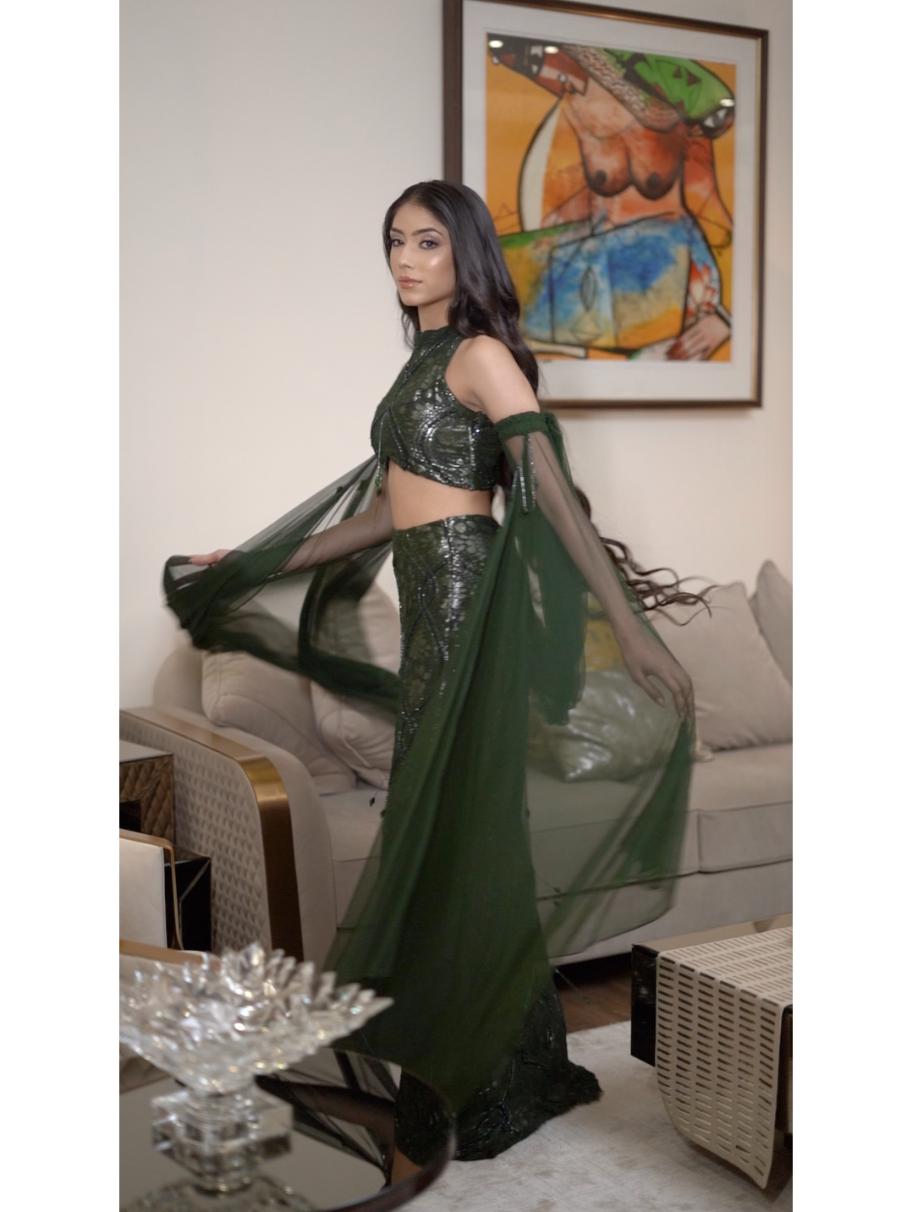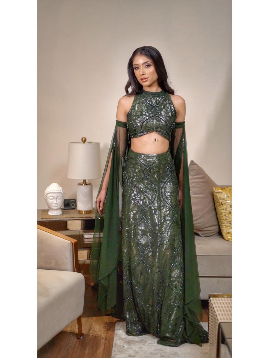 green crystals and cut dana embroidred on a lace lehenga skirt & blouse, paired with a net-draped dupatta