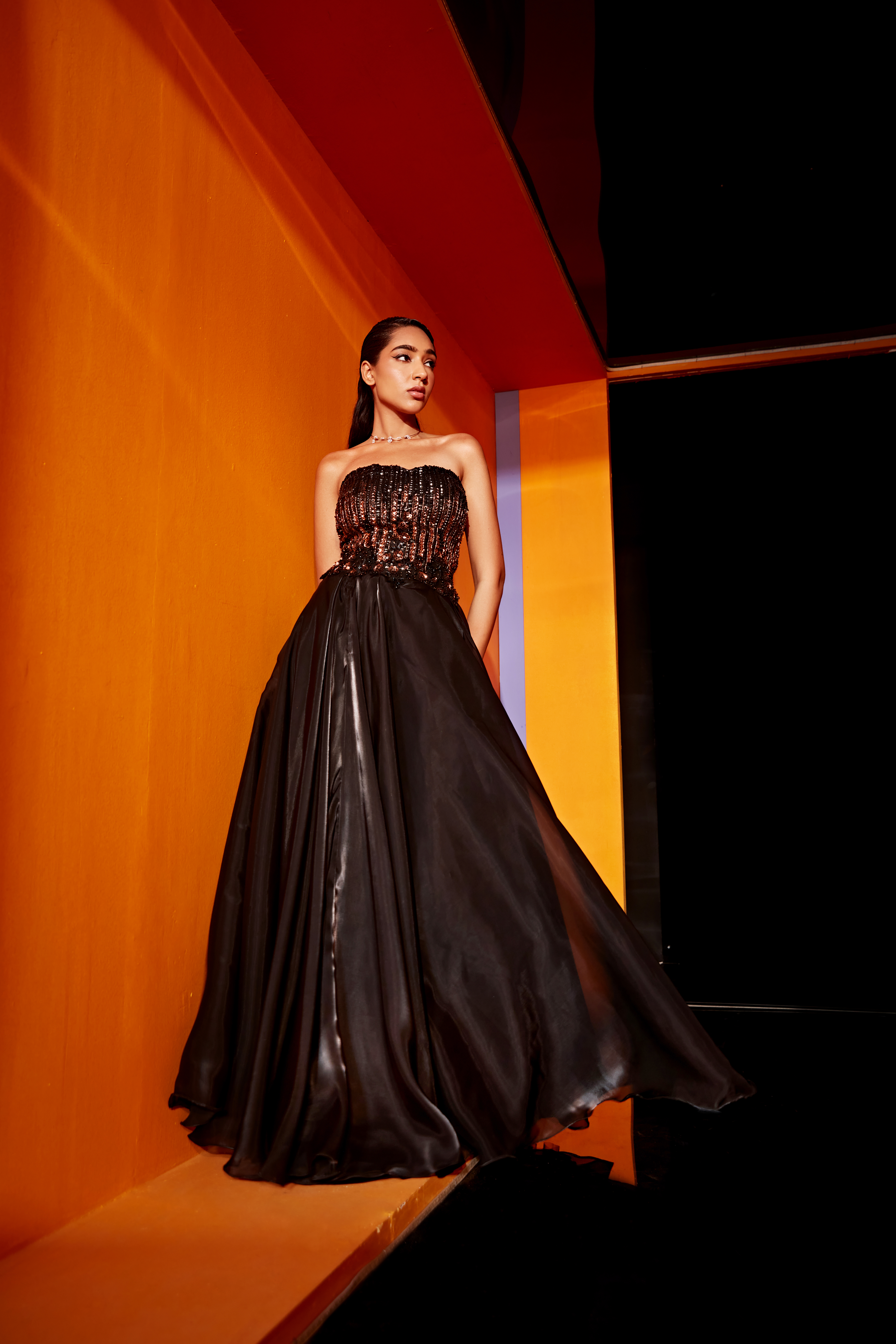Black satin organza straight falling gown featuring an interesting mix of black and copper colored embroidery.