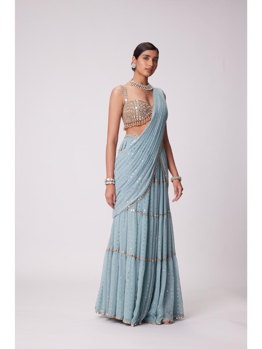 Vvani Vats – POWDER BLUE MULTI TIER HAND EMBROIDERED SAREE SET – Nikaza Asian Couture