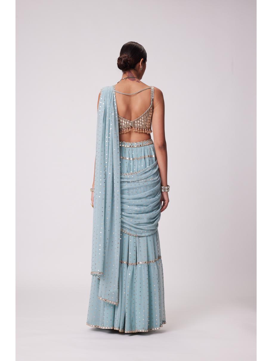 Powder Blue Multitier Hand Embroidered Saree Clubbed With Real Hand-Cut Mirror Embroidered Sleeveless Blouse.